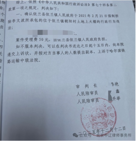 黑龙江胜诉案例:李女士蔬菜养殖大棚被拆除,依法维权一审确认违法!